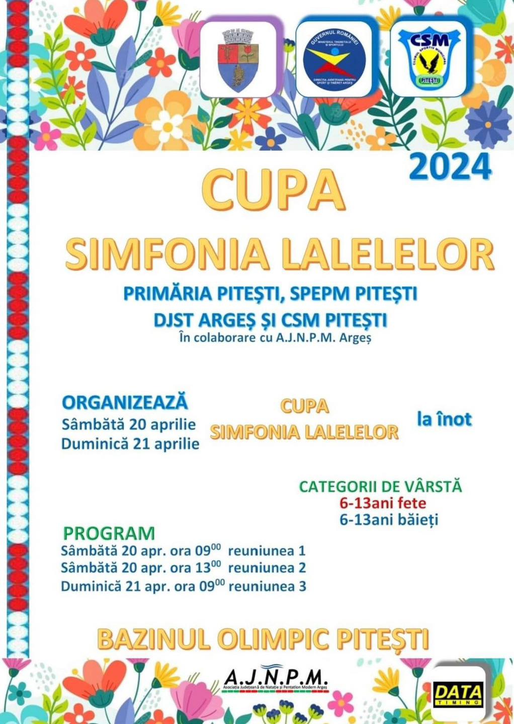 Primăria Municipiului Pitești, prin Serviciul Public de Exploatare a Patrimoniului, DJST Argeș în colaborare cu A.J.N.P.M Argeș, organizează, în perioada 20-21 aprilie 2024, competiția „Cupa Simfonia Lalelelor la înot”, care va avea loc la Bazinul Olimpic Pitești.