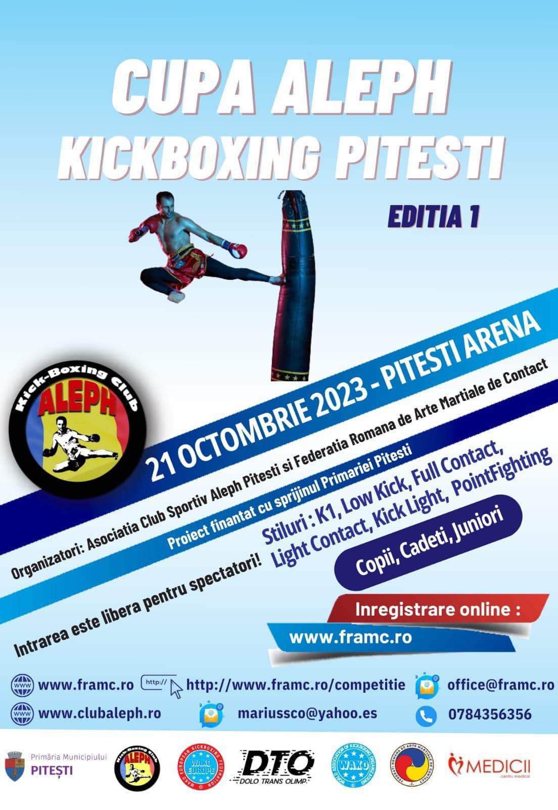 Sâmbătă, 21 octombrie 2023, începând cu ora 09:00, Arena Pitești va găzdui o competiție inedită, organizată de către Aleph Kick-Boxing Club, cu sprijinul Primăriei Municipiului Pitești: Cupa Aleph Kickboxing Pitești pentru copii și juniori.