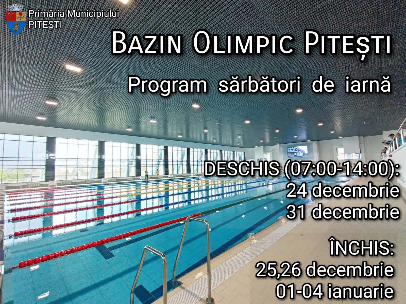 Primăria Municipiului Pitești, prin Serviciul Public de Exploatare a Patrimoniului (SPEP), anunță programul special de funcționare a Bazinului Olimpic în perioada sărbătorilor de iarnă: