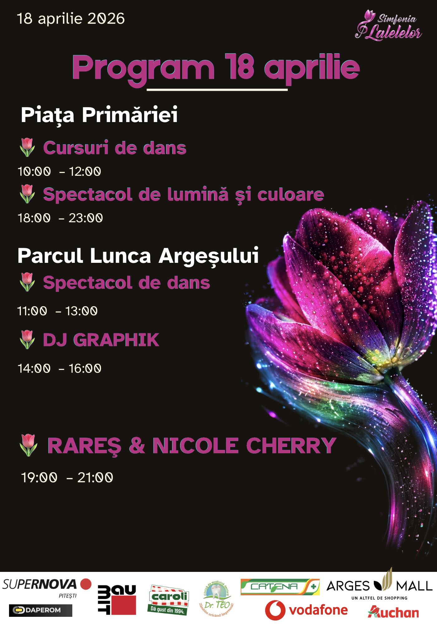 • 18:00 – 23:00: Spectacol de lumină și culoare - proiecții de tip video mapping artistic, cu temă florală, pe clădirea Primăriei Pitești.