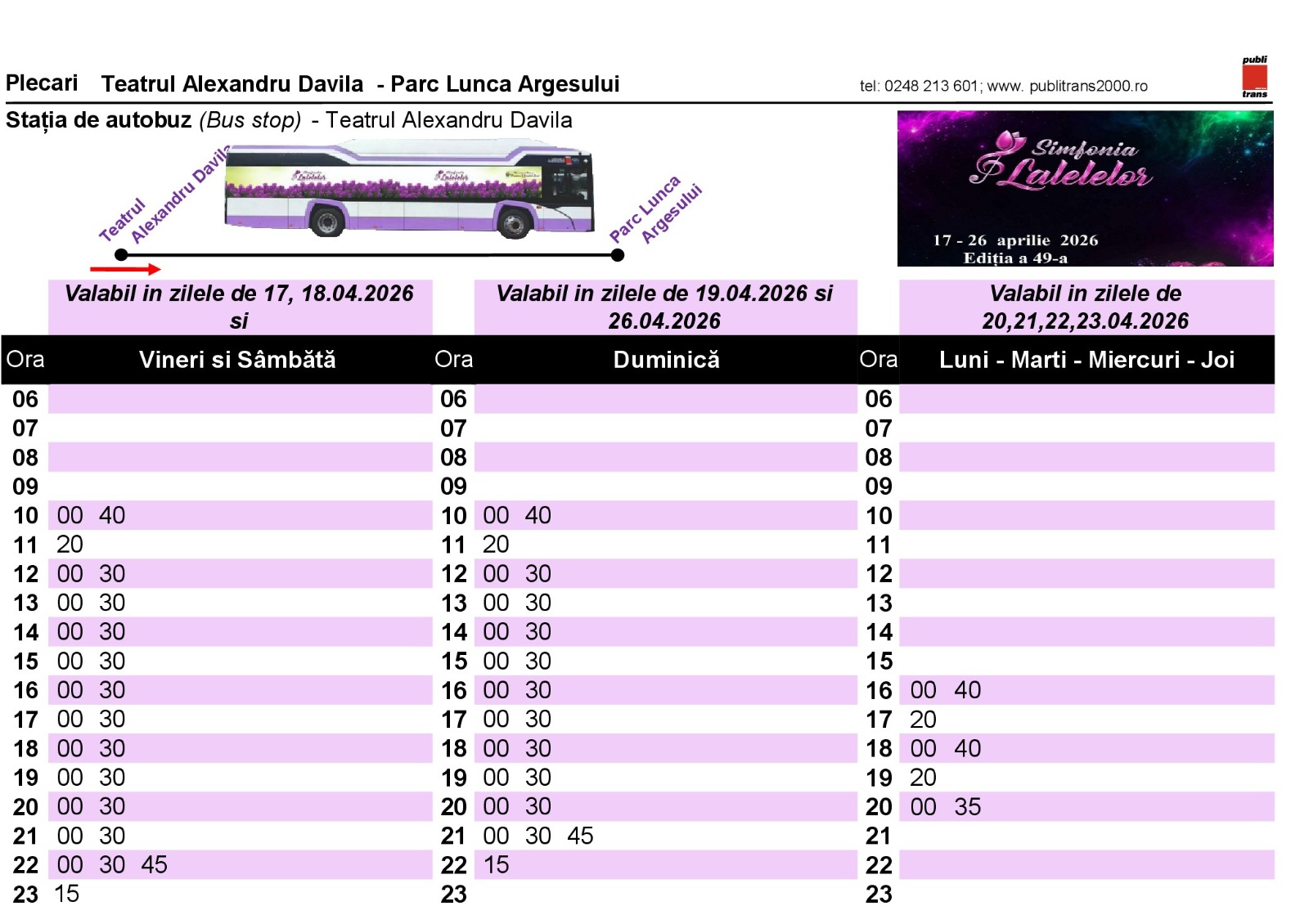 Ediția a 49-a a „Simfoniei Lalelelor”, organizată în perioada 17 - 26 aprilie 2026, oferă vizitatorilor transport GRATUIT, prin Publitrans 2000 S.A., în cele zece zile ale festivalului.